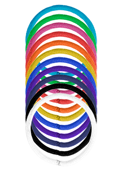 Vollständig metallfreie Zopfgummis für maximale Schonung der Haare. Hohe Elastizität und Reißfestigkeit.